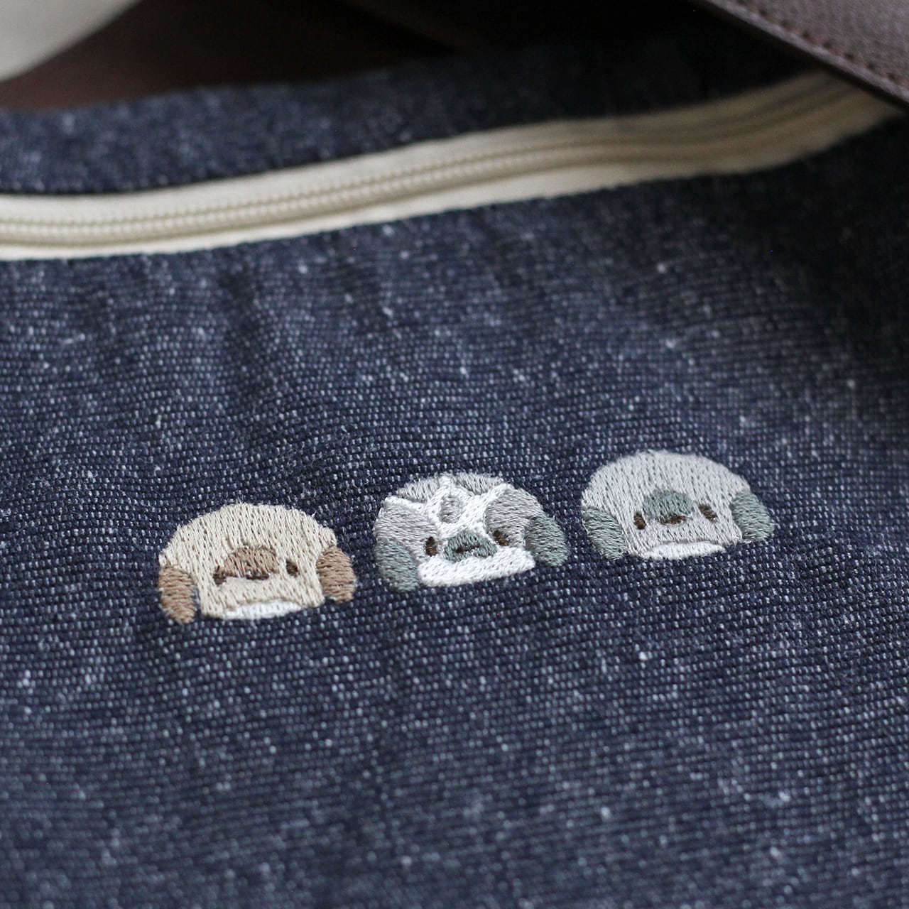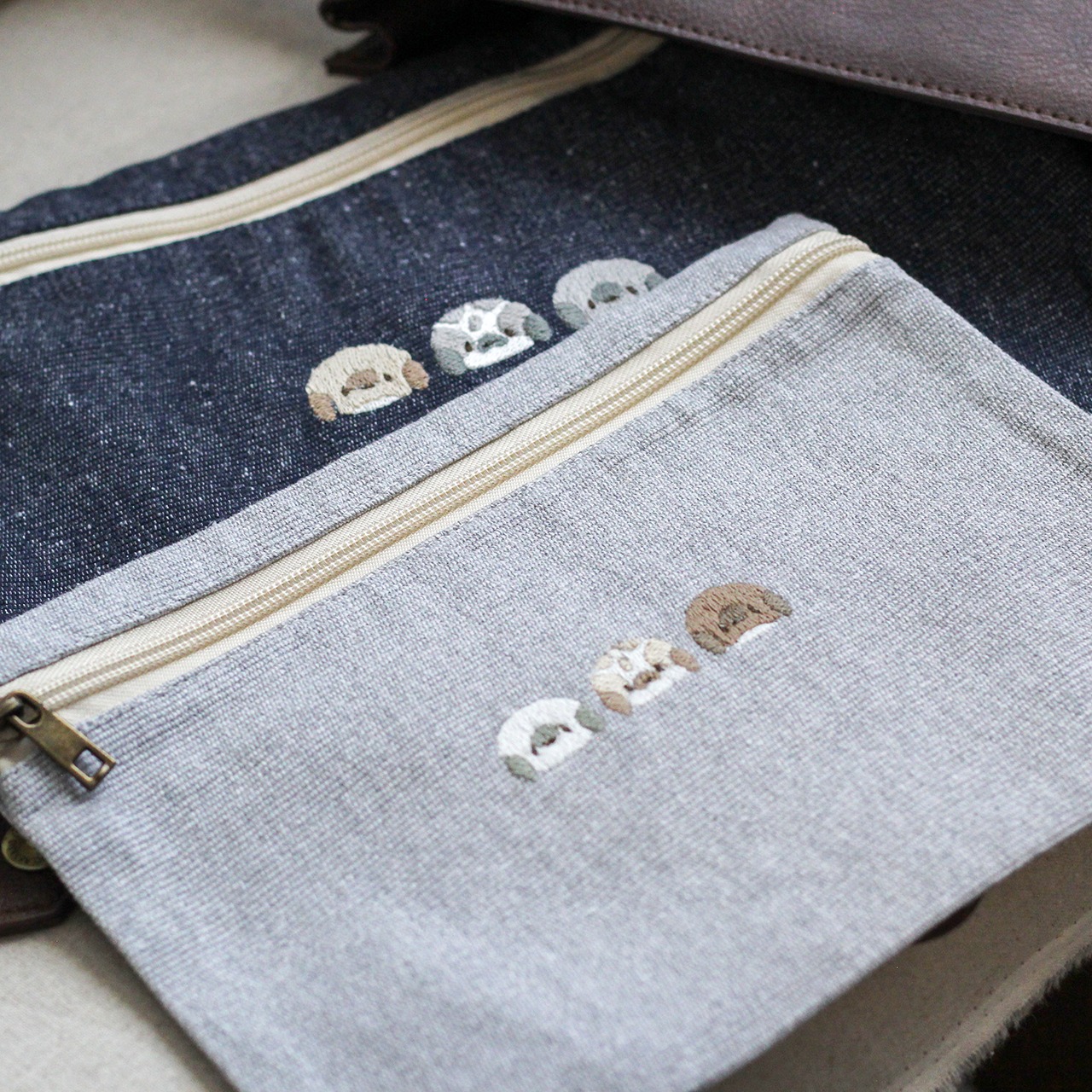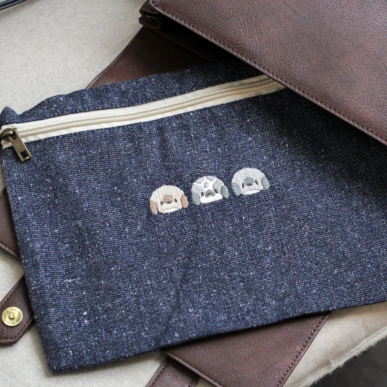 やわらかな生地に、3種のたれみみさんを刺繍したポーチができました。
